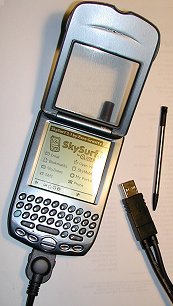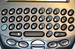 Screen and Data Entry This particular PDA has gone away from the Graffiti pad that has become commonplace with many PDA units. If you are not familiar with the Graffiti pad, many PDAs have a lower section of the screen that one can enter text with the stylus (see the picture of the Palm IIIxe above). Every letter and number has a particular Graffiti stoke that is translated by the PDA into text. Being familiar with the Graffiti pad, I was first rather disappointed that I now had a keyboard to enter text, but I quickly found that I could enter text at a much faster rate than my Graffiti pad entry rate. I should mention here that Handspring does have another model, the Treo 180g, that does come with the Graffiti pad for those die-hards.Although the keyboard is quite small, entering text was easy and even someone with big thumbs wouldn't have a problem. Each letter requires a good positive press, so even if you end up hitting the surrounding letter keys, only the key with the firmest press will be recorded. I found that using the thumbs was the easiest way to enter text, although this did mean that I was often putting the stylus down, or worse yet, into my mouth and chewing on it! Of course, if the unit is on a table or desk top, then you can always enter text with your fingers. As mentioned above, this particular unit comes with a 16 shade grey scale screen. Compared to a cell phone, the screen is quite large at 160 x 160 pixels. Most functions and settings are activated by tapping the stylus on the top of the screen and a menu appears. In many applications, there are also shortcut keys located along the bottom of the screen. The resolution is quite fine and the screen is a nice size to do most of the work that you would need to do on a PDA.